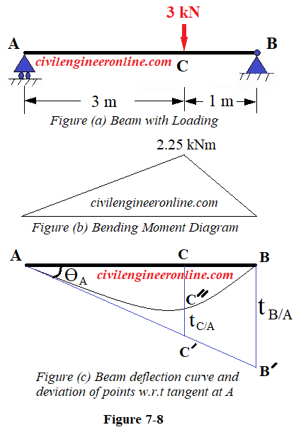 First draw the Bending moment diagram for the given beam as shown in figure 7-8(b) then draw the elastic curve (deflection curve) of the beam as in figure 7-8(c). In Figure (c) draw a tangent from A then draw projections of points B and C on the tangent from A and let these projections meet the tangent at B’ and C’ respectively.